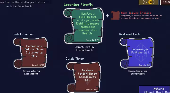 Destroying the Obelisk means siphoning all of its magical Vis. The Obelisk can fight back and will create increasingly stronger amalgamations to stop Willow in their tracks. However, Willow can use this siphoned Vis to their advantage - by creating powerful Enchantments.Enchantments are upgrades to Willow that can make them significantly more powerful. Enchantments can be attuned reguarly, whilst also spending Vis collected throughout the waves. Powerful Enchantments can drastically change how the game is played.