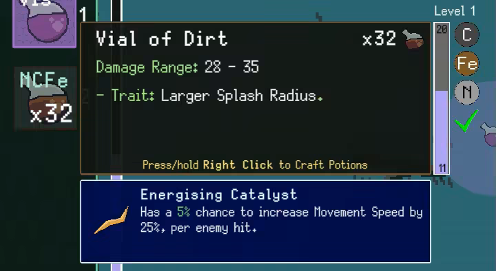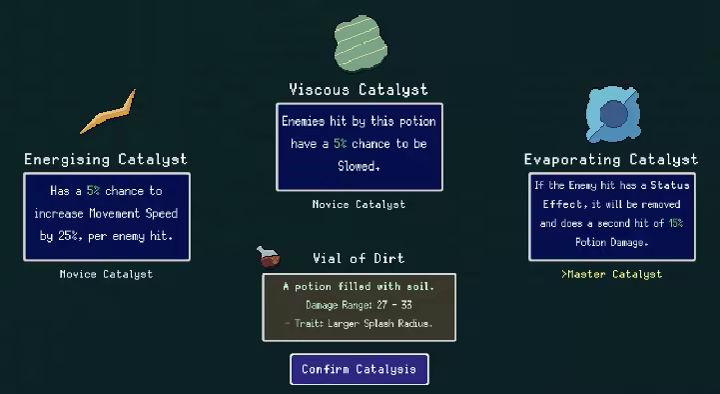 Catalysts are powerful augments that you can attach to your potion, granting it new abilities and power.Both Catalysts and Potions can each have unique effects that work in synergy with one another. It's important to strategise which Potion/Catalyst combinations are best!