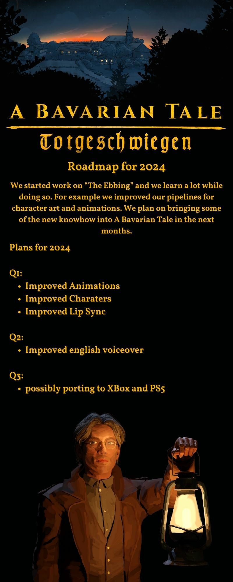 Roadmap for 2024 We started work on “The Ebbing” and we learn a lot while doing so. For example we improved our pipelines for character art and animations. We plan on bringing some of the new knowhow into A Bavarian Tale in the next months. Plans for 2024 Q1: Improved Animations Improved Charaters Improved Lip Sync Q2: Improved english voiceover Q3: possibly porting to XBox and PS5