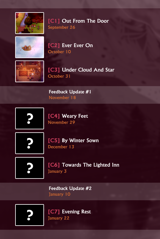 In addition, I've updated the release schedule for future chapters to reflect these new updates and developments going forward. It's possible I won't be always be able to hit these exact dates, and I appreciate your patience if that ends up being the case. I'm doing my best to release new content regularly, but as a solo developer during a very busy time of year, I can't always pin things down 100%.