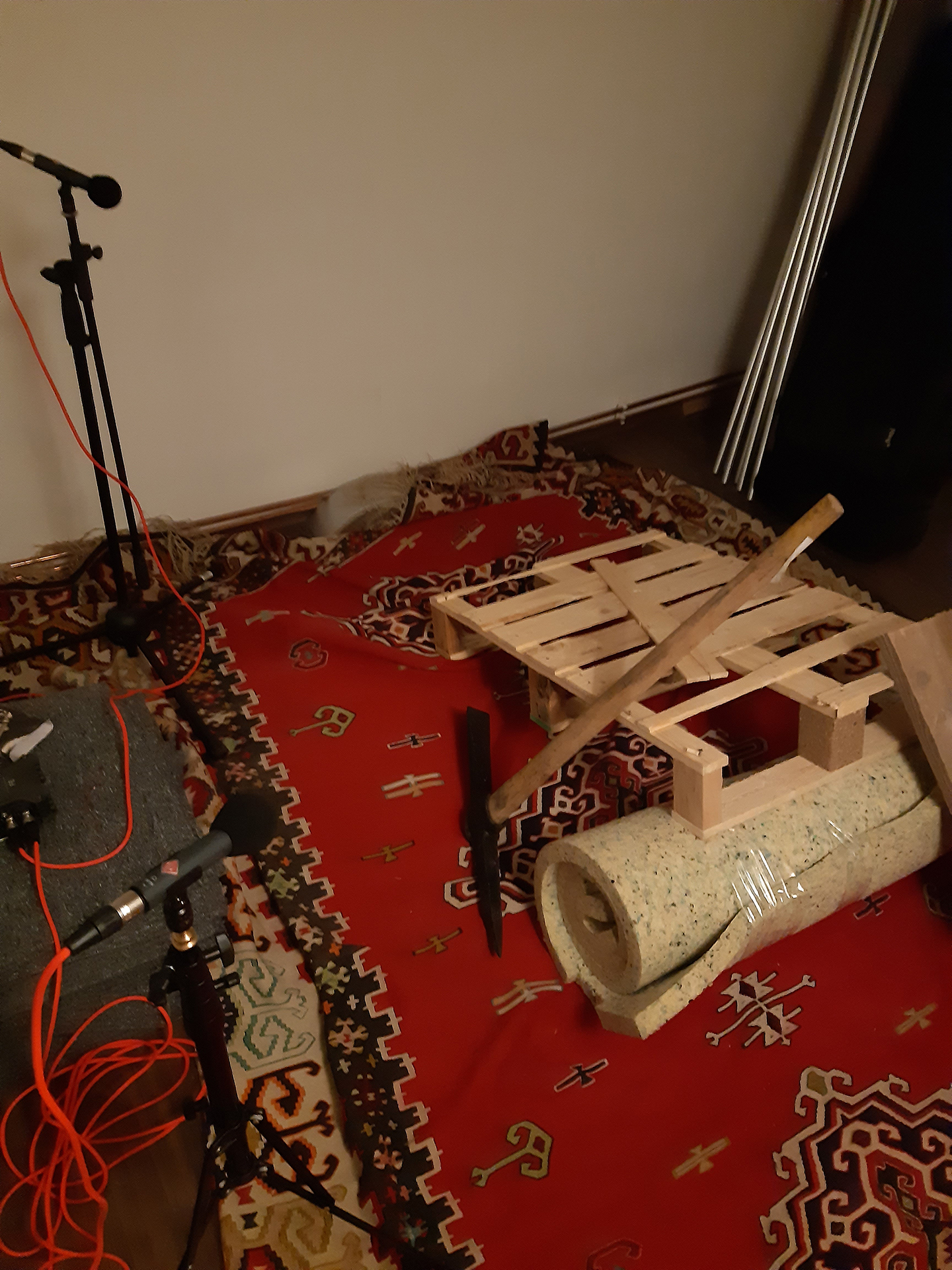 Whether outside or in our cozy and sound-proof studio, we always strived to capture even the most delicate nuances. Findings from attics, such as an old pair of leather shoes with wooden soles, allowed us to record consistent footstep sounds for the player: for over 14 surface types, we recorded ourselves walking and running. This way, players always have the feeling of consistency, regardless of whether they are wading through knee-deep water and crawling through mud in the trenches, or wandering through the Schmitt family's mansion with its creaking parquet floors, dusty carpets, and elegant marble tiles. For the tools, we purchased, for example, a replica of a gas mask 17 of the German Imperial Army, one time we scavenged old wooden pallets, which we then shattered with a pickaxe in the studio.