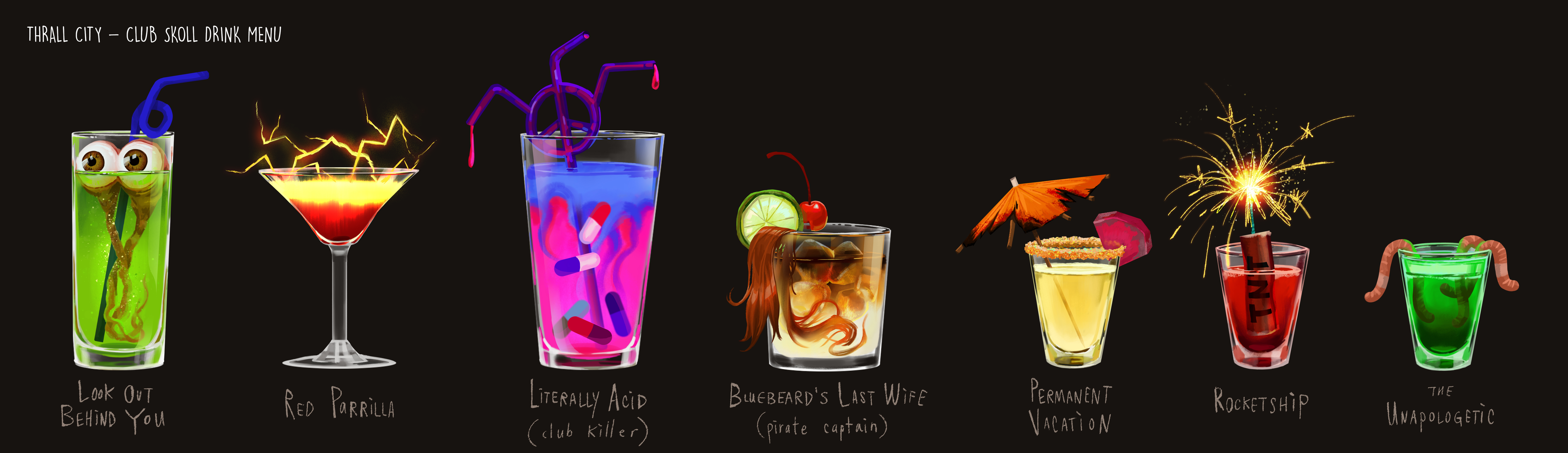 So to aid them on their extraordinary quest, Milo and Lola are going to need a little liquid courage. To that end, we’ve created over 30 drinks to get sauced on throughout the game, each providing a different type of personality boost. Think of it like equipping a weapon, but for your words… every bar has a few different drinks that, once imbibed, give extra dialogue choices. Want to talk like a raging psycho? Order a Global Extinction. Fancy some vaudevillian flair? Grab a Great Exhibitionist. Don’t even ask what a Jeffery Bomber does.