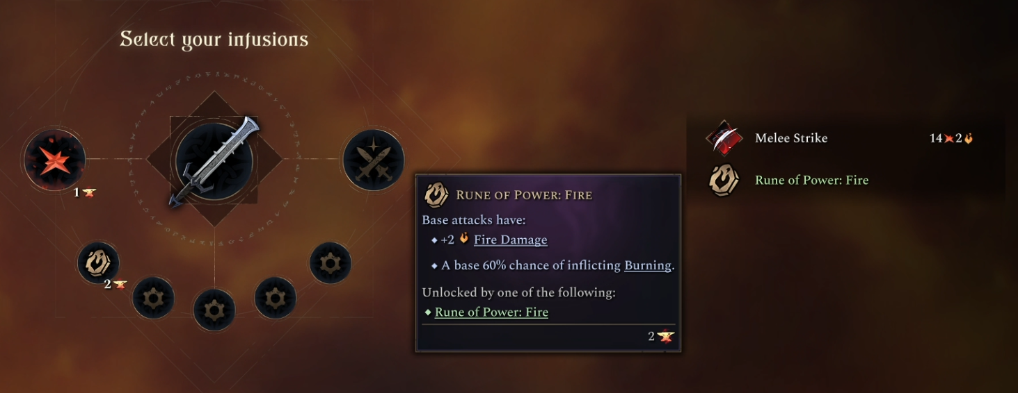 Then come the Rune Infusions, which are special item infusions unique to the Giant Kings. Each clan has their own infusions, for example the Fire Giant King can grant a weapon more fire damage and a burning chance, make an armor that grants immunity to burning or enchant a wand with the ability to summon a Lava Runestone on the battlefield that burns all those around it.