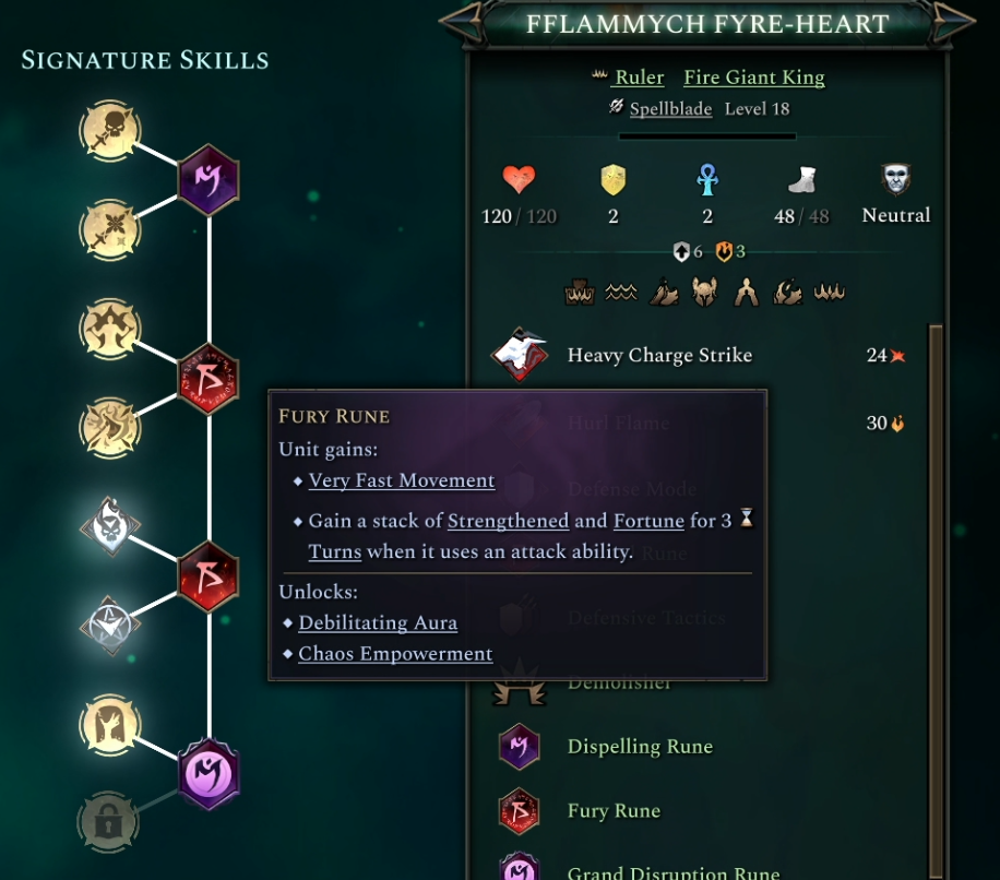 At level 8 the Giant gets to pick a stronger rune, like the Fury Rune in the above image that changes the Giant’s movement speed and grants buffs as it attacks. Other runes at this levels include the Life Rune (Nature) which grants the giant Undying, reviving after a turn in combat, or the Brawn Rune (Materium) which grants the Mighty Stomp ability that in a 2-hex cone can apply Immobilized, Stunned and Bleeding.