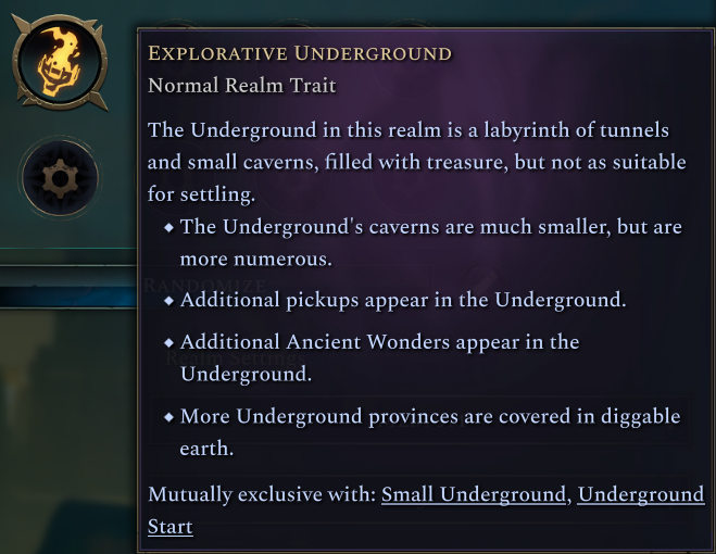 We still wanted players to also be able to experience the Underground as an explorer - mainly playing and settling on the surface, but being able to gain treasure in the depths below and even annex partially underground in order to grab more nodes or Ancient Wonders. Therefore, we added a new realm trait called Explorative Underground. The realm trait is pretty self-explanatory, so check it out below!