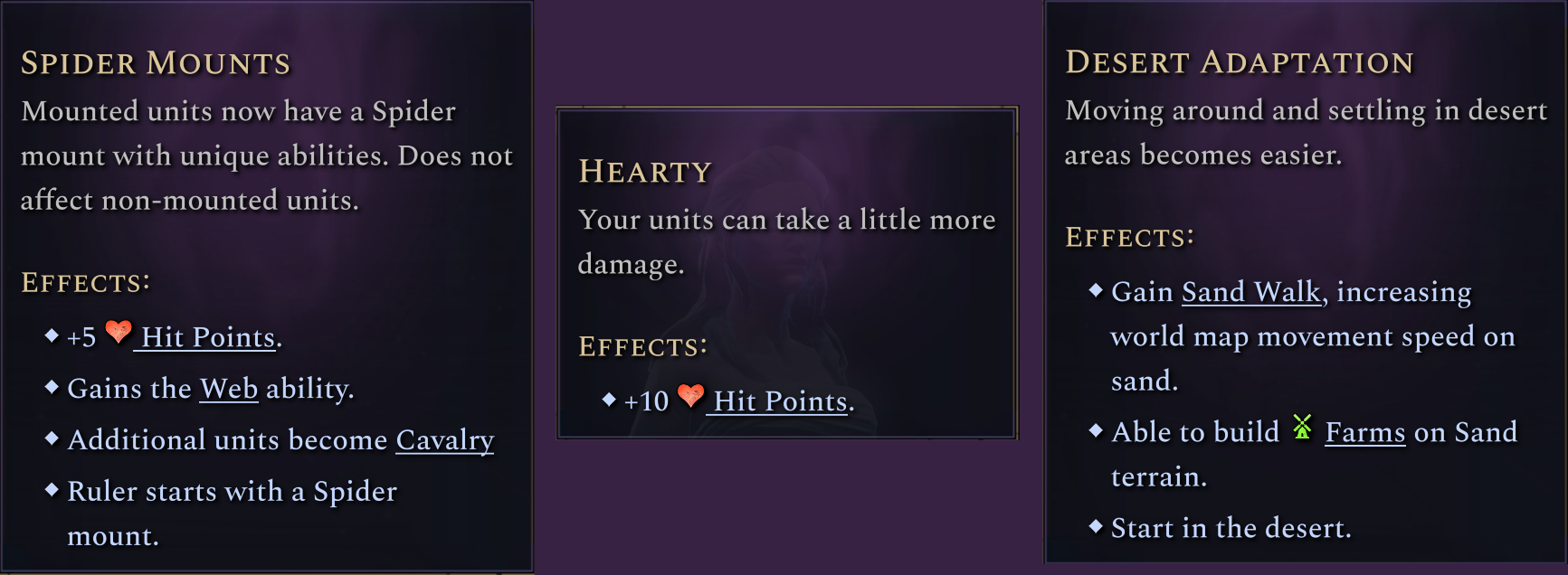 Since release we’ve realized that the Body/Mind model of traits has some serious issues, the greatest of which is that all traits have the same value despite them not all having the same potency. The Spider Mount trait is clearly more powerful than the Hearty trait, which is more powerful than Desert Adaptation, yet they all cost a single slot.