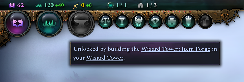 Hello, I am Sam Minh, designer at Triumph Studios and today I will be talking about another free feature of the Golem Patch, the Item Forge. It is making a return from Age of Wonders 3, new and upgraded for Age of Wonders 4! The Item Forge is a way to create your own custom hero items - you can forge armor, weapons, rings and other items that your Heroes can use in combat. Craft that missing helmet that you never found, that higher tier bow that your ranged hero needed, or just make the strongest item you can afford that fits your hero’s playstyle. Since this is part of the free Golem Patch, everyone will get access to the Item Forge. When you start a new game, or load your save, you will see a new button with an anvil at the top of your screen. It will be grayed out because you will first have to build the Item Forge in your Wizard Tower.