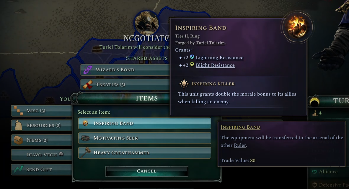 You can trade your items with other players. Since what you can craft depends on the Magic Materials you have, other players might be able to craft the item you need, or you might now be more inclined to trade Magic Materials to unlock the Infusions yourself. AI Rulers will also periodically have a stock of custom magic items for you to buy, allowing you to benefit more from alliances and giving you the opportunity to acquire unique items that you might not be able to obtain yourself.