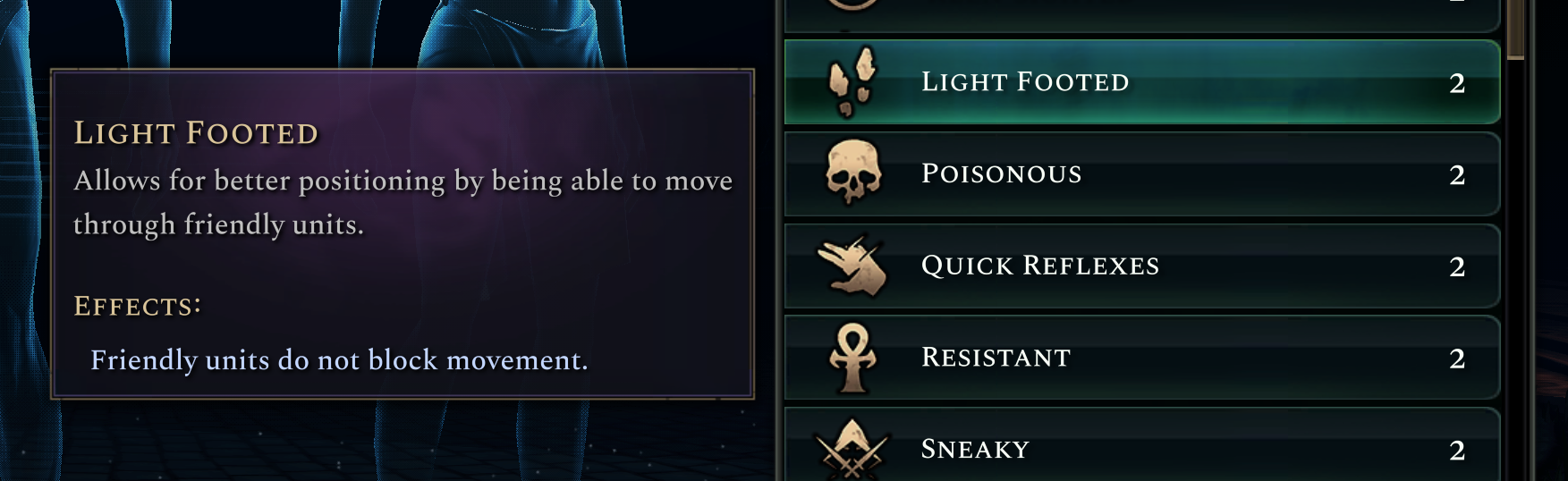 Light Footed is one of the default traits for the new Avian form, and it gives your units an extra dimension of freedom while in combat. A light footed unit can move through any allied unit (including those which do not have light footed themselves) allowing you to retreat ranged units through shield walls, and easily rearrange your units in bottlenecks to control the battlefield.