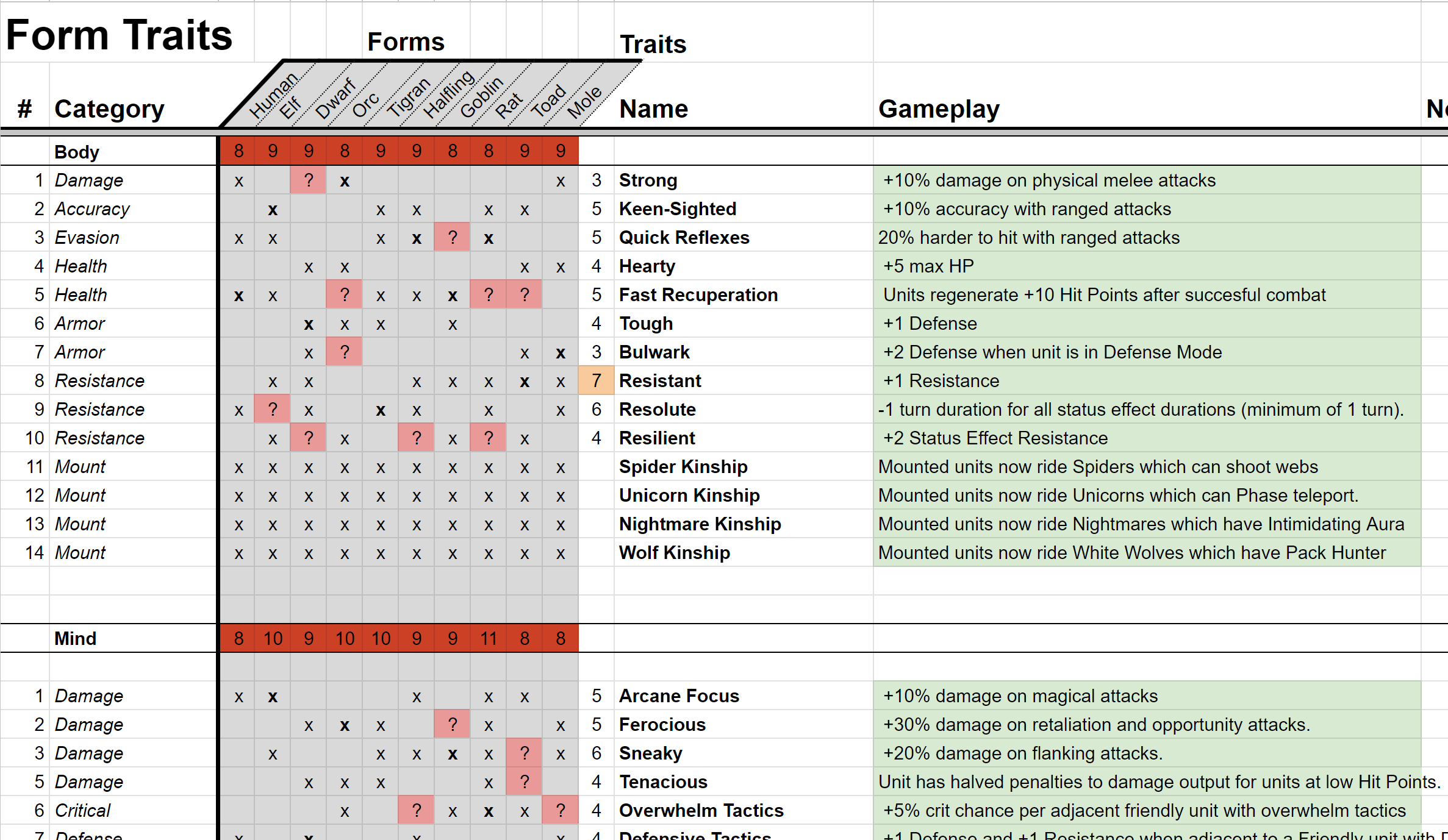 A later iteration gave each form a selection of traits it could choose from - a selection we curated to try and fit what we felt the form was about. So Elves could be good with bows and magic, but wouldn’t be able to take traits that made them tougher or stronger. This same iteration split the traits between Mind and Body, which would give players far more flexibility in their races: