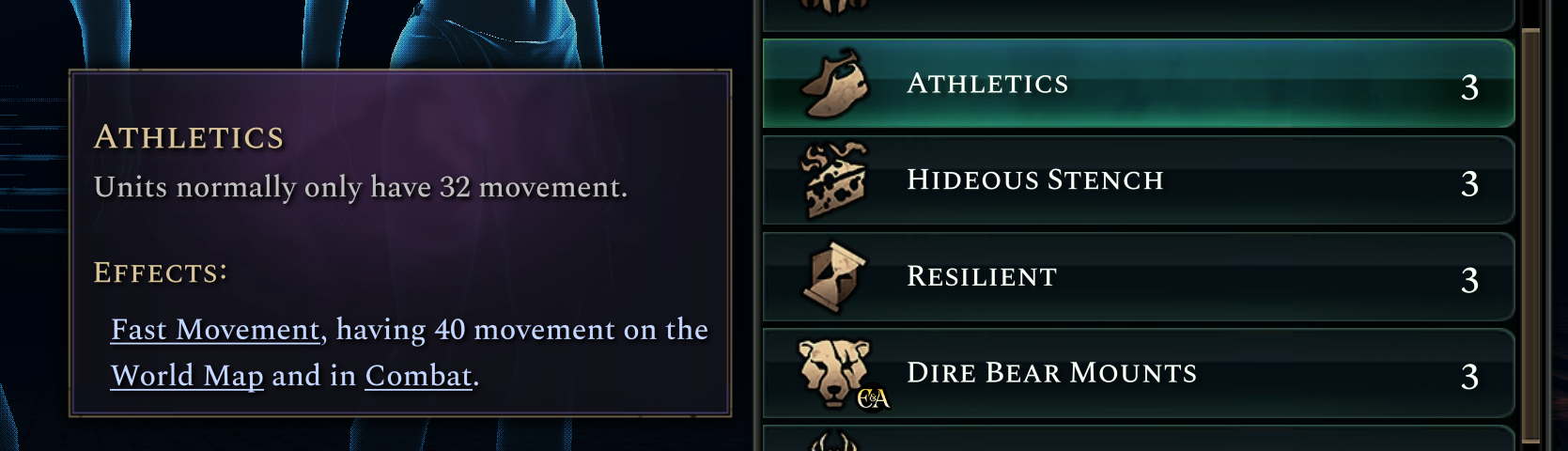 Athletics replaces Fast Initiative (which sped up units for the first turn of combat) and grants all your non-cavalry units a speed boost both in combat and on the world map. I’ve been assured by our internal testers that this isn’t hopelessly overpowered, but we’ll have to see!