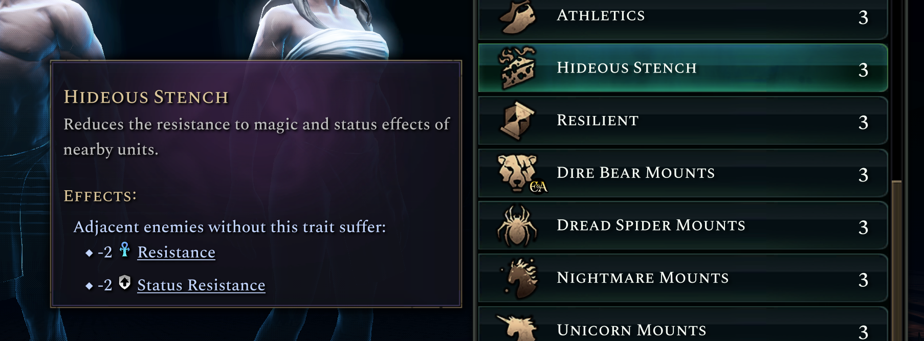 Hideous Stench is one of my favorite traits from Age of Wonders 3, where it was only available to the Untouchables unit. This trait is extremely strong for builds that rely on magic damage and status effects, such as those built on the Dark culture. It combines well with Poisonous (60% chance to poison melee attackers) since melee attackers are guaranteed to be adjacent and will therefore be more vulnerable to poison!