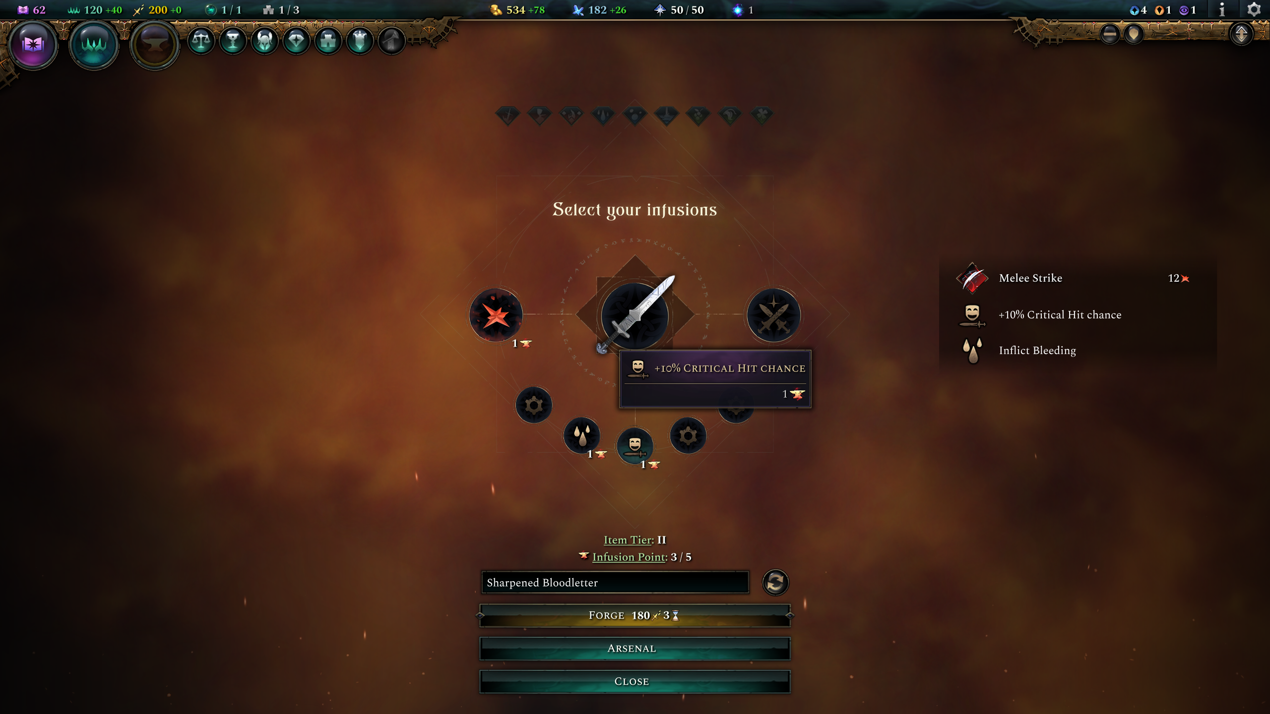 The next step is to add infusions, which are the special effects that you apply to the item. In the case of this sword, we can change the damage channel, add an active ability, and add multiple passive abilities. At the start of the game you only get access to some basic infusions, so in this case we’ll add the Inflict Bleeding and +10% Crit chance infusions. These infusions also increased the item to Tier 3, increasing its damage output.