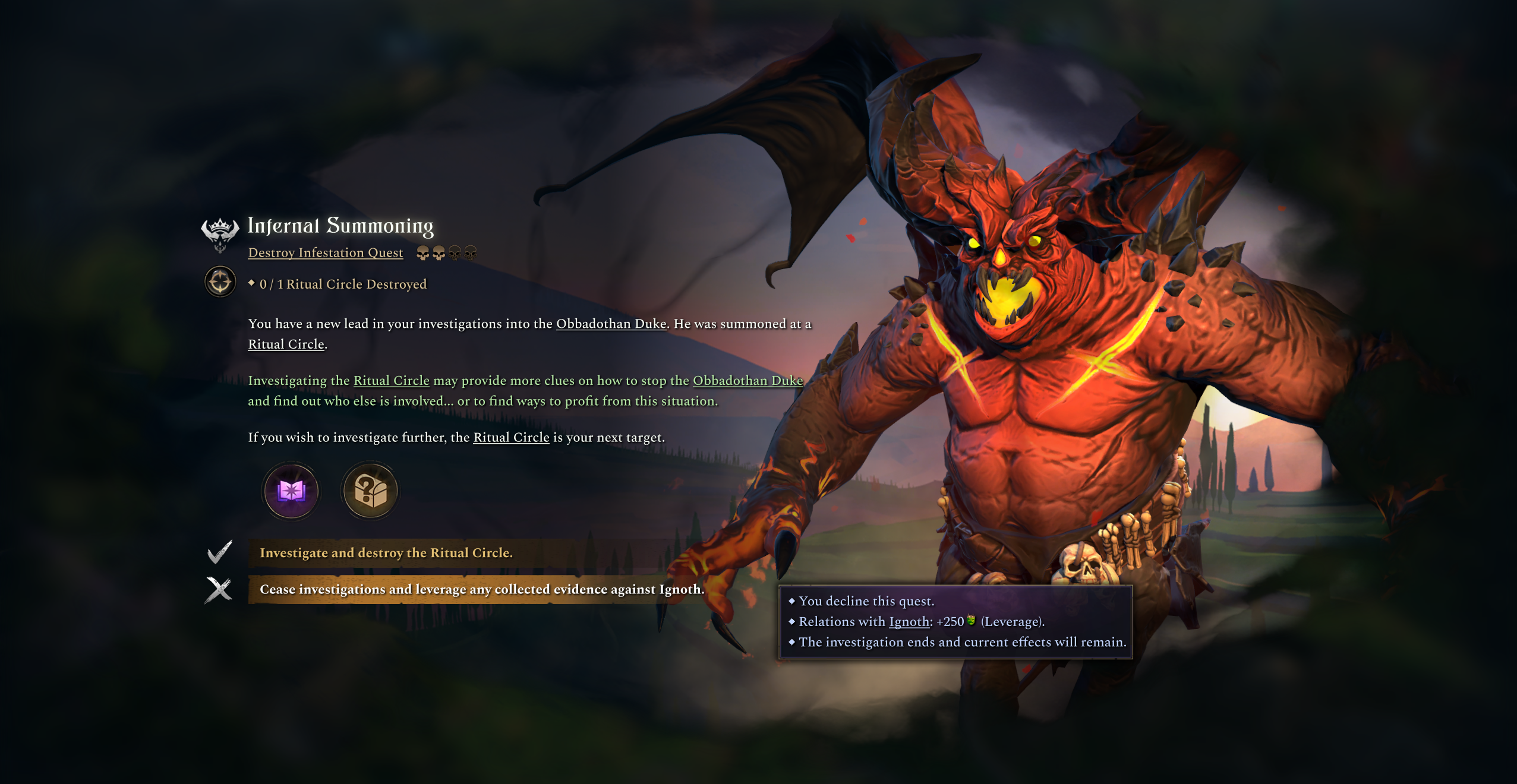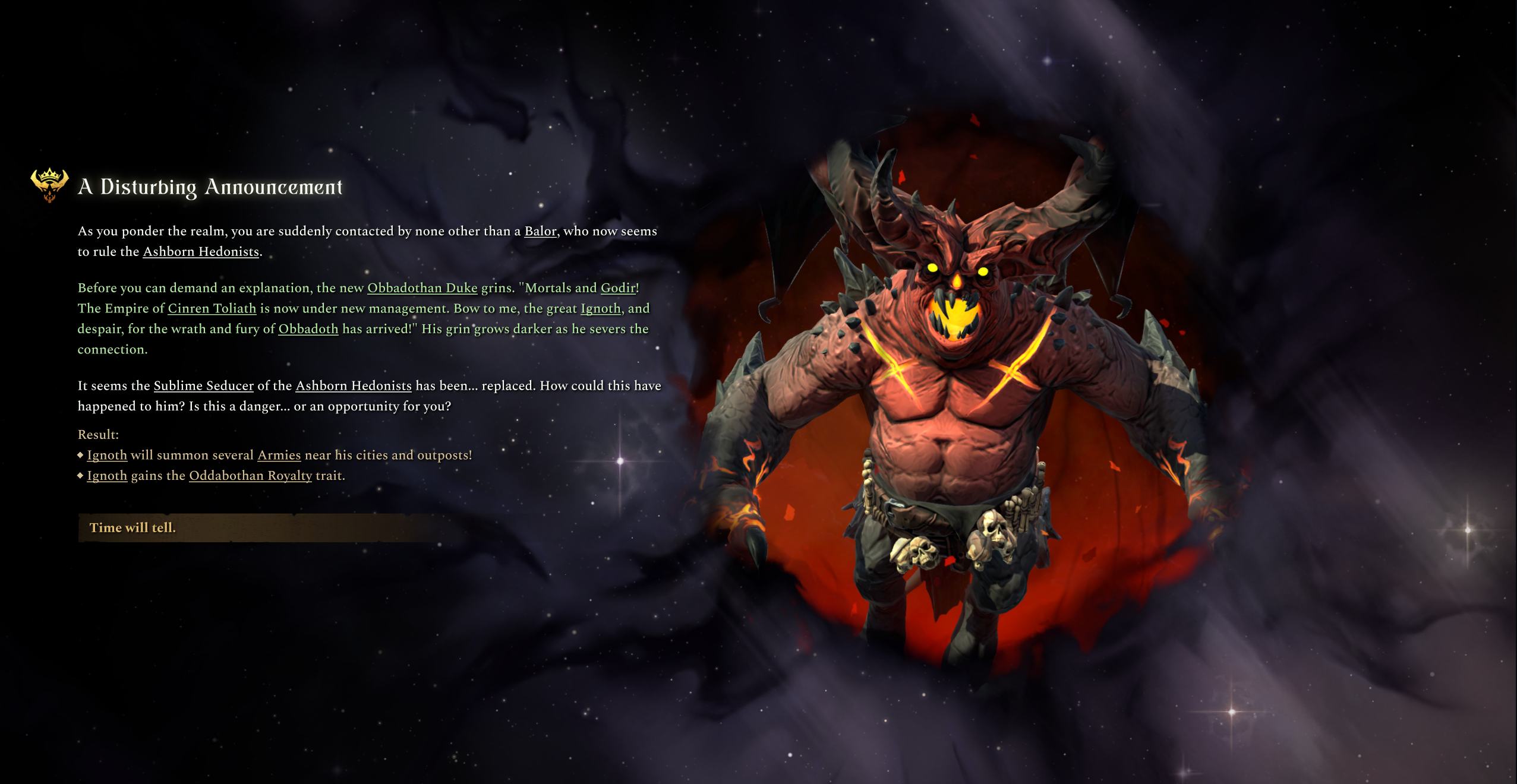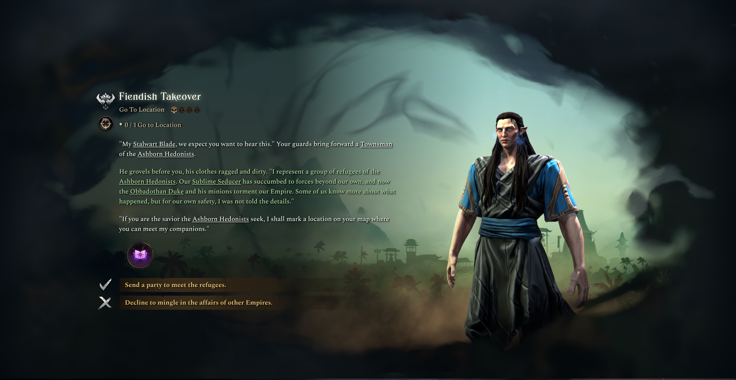 [spoiler]Below I will share a few images of the “Fiendish Takeover” Intrigue Happening to walk you through its flow in a bit more detail! Like any Happening, the Intrigue starts with an event that shows you what changed.