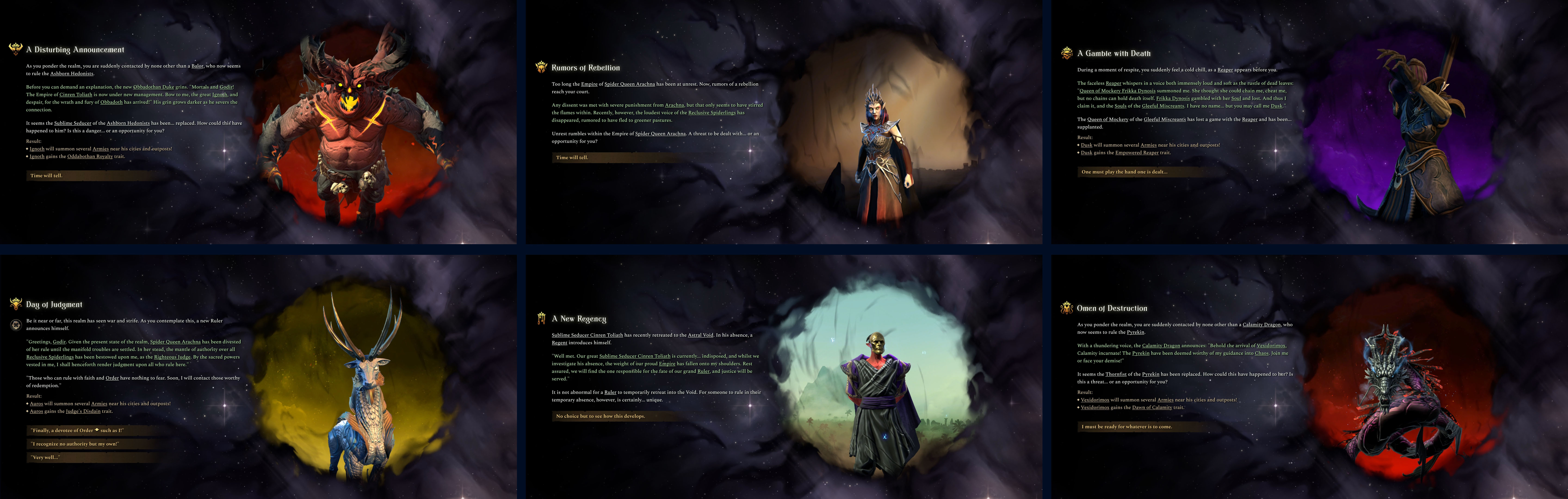 In the Eldritch Realms DLC we introduced Cosmic Happenings - global [url=https://forum.paradoxplaza.com/forum/developer-diary/dev-diary-6-narrative-events.1570462/]Events[/url] and effects that shake up the game for all players involved. Intrigue Happenings use the same system… on a more personal level. Intrigue Happenings are event (and quest) chains, designed to target an (AI) Ruler on any [b]single-player[/b] non-Story Realm. They aim to shake up the mid-game diplomatic status quo and encourage you to investigate and decide on the fate of the affected Ruler - who may be affected by internal turmoil, or may have been replaced by another entity entirely. The affected Ruler, meanwhile, will start to influence the realm in their own ways.