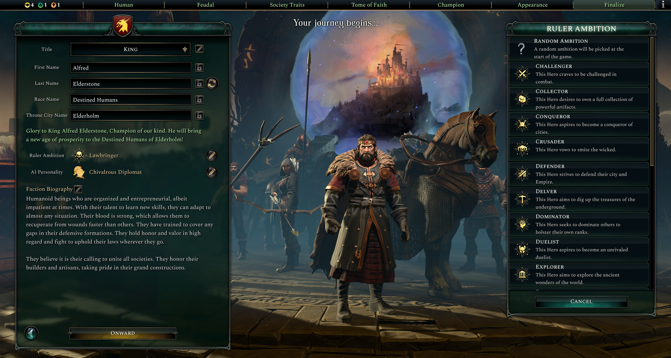 Ambitions are chosen as a set, rulers may choose them during the creation process while heroes will have a random set of ambitions. Each set contains a Major and Minor ambition