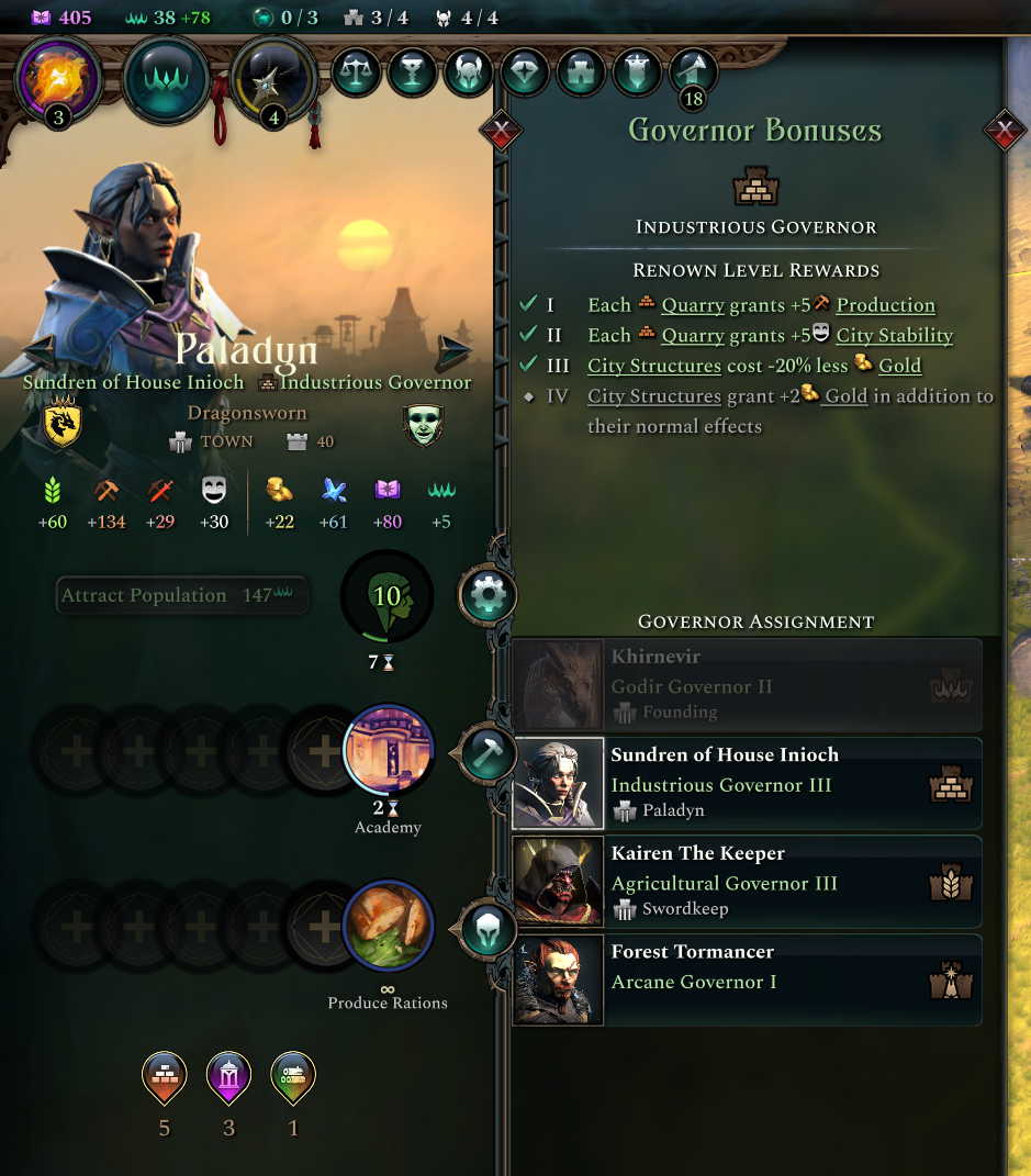 Governance traits are a new trait given to each hero that determines the effects they grant their governed city, these usually entice a city to specialize in a particular way, leading to more variation in the empire’s cities and a more noticeable impact from the Governor’s rule. Each hero has a random Governance trait, while rulers always have the very generalist Godir Governor trait, which boosts the throne city significantly.