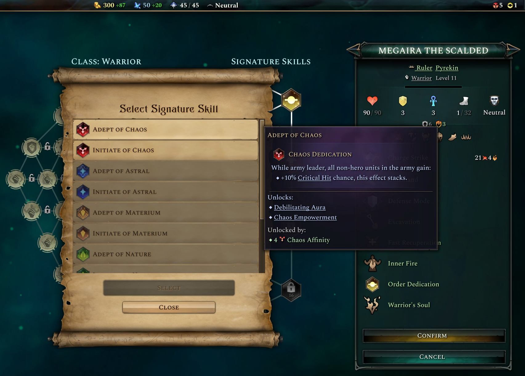 The next big item on the block is signature skills, previously these were a small pool of active abilities, when reaching particular milestones the hero would get to pick a signature skill from a list of random options. This had several issues; A lack of control, wildly varying power levels and dilution of the heroes role. Everyone would always pick the same skills, and particularly the summon abilities were problematic. Thus to put it bluntly, these are no longer the same. Many of these skills have been reworked and used elsewhere. [b]Affinity Dedications[/b] For Mortal Champions and Wizard Kings, the signature skills take the form of Affinity Dedications. These grant effects that empower the army that the hero leads and unlock a pair of hero skills that support the builds and identity associated with that affinity. To choose an affinity dedication, the hero must first reach the appropriate level, then the empire must have the appropriate affinity. At level 4, only Initiate dedications may be chosen and only of the affinities the empire has. At level 8 they may choose either Initiate dedications they do not yet have (with the same requirements) or any Adept level dedications their empire has enough affinity for. At level 12, Master level and lower can be chosen, and lastly at level 16, Paragon or any other level.
