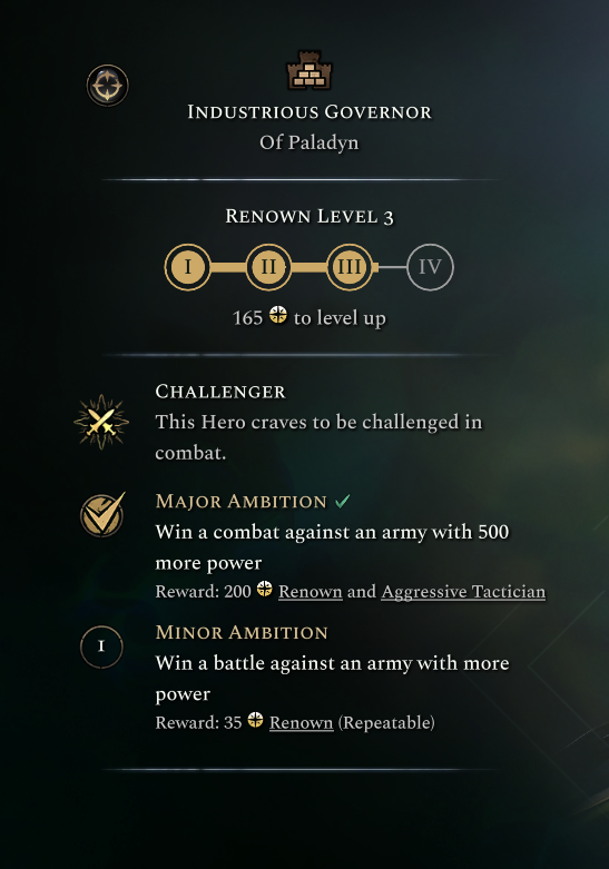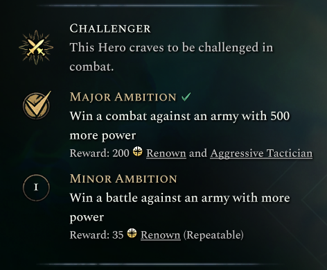 Major Ambitions can only be completed once per hero, but grant a much larger reward and unlock a unique skill for the hero that suits the deed they’ve accomplished. A Duelist who manages to slay a ruler in single combat for example gains increased damage and defense against heroes!
