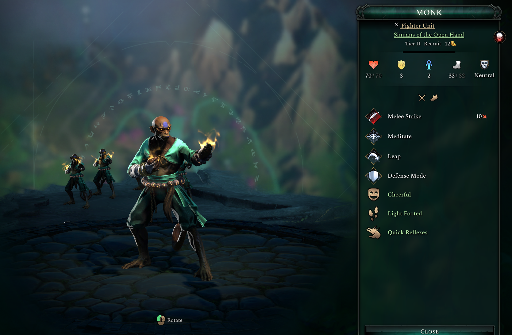 The Monk is a Fighter that conducts the tomes empowering magic into its strikes. It punches its enemies and on a third strike in the same turn it triggers a Spirit explosion on the target that also hits adjacent enemies. They have a Leap free action ability which allows them to jump up to 2 hexes, which helps them position and trigger that explosive third strike. Additionally, it also has a Meditate ability which heals, removes 2 Negative Status and places them in defense mode, making the monk a nice allround unit to have!