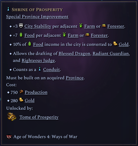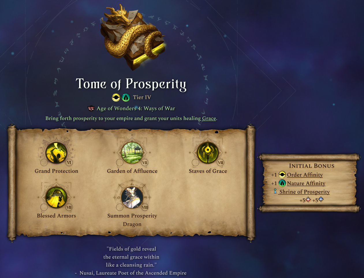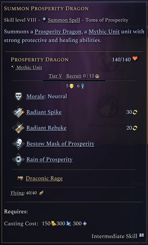 Summon Prosperity Dragon grants access to a new tier 5 unit of the same name. This is a powerful support mythic unit and so its spell costs extra gold in order to cast. The other Prosperity units are accessed by building this tome’s special province improvement, the Shrine of Prosperity.