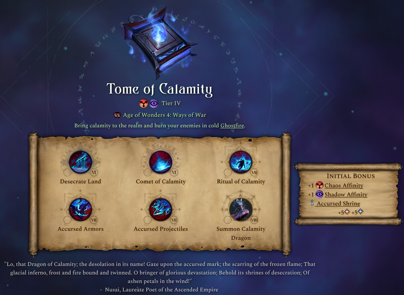 The other side to the Tome of Prosperity is the Tome of Calamity. Also Tier IV, this Chaos Shadow tome is all about Accursed Fiend units, Ruin provinces and the Ghostfire effect.