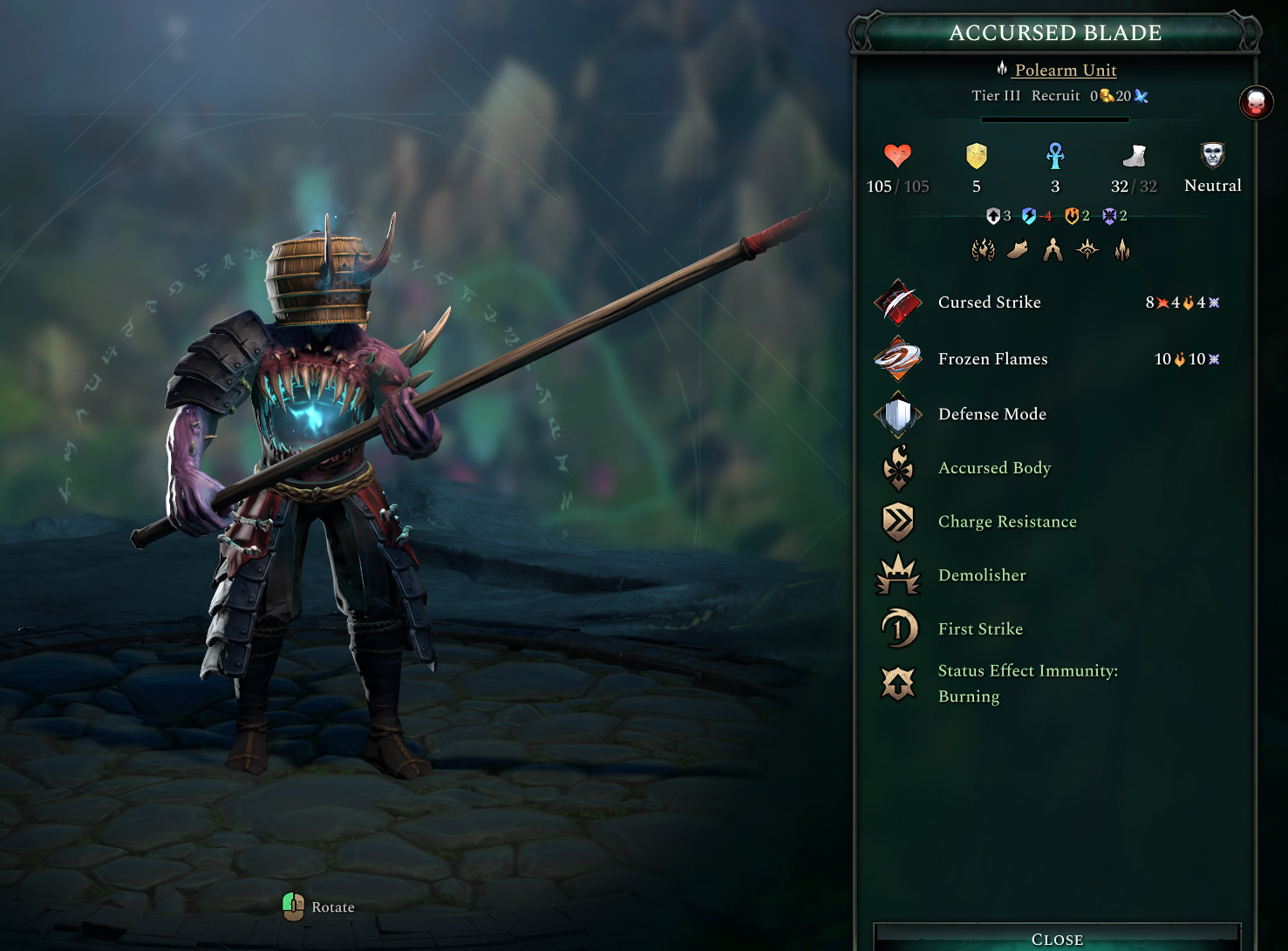The Accursed Blade is a Tier III Polearm Unit. Like many in this line, its main attack applies Ghostfire while its Frozen Flame ability attacks all adjacent enemy units with a chance to Freeze them.