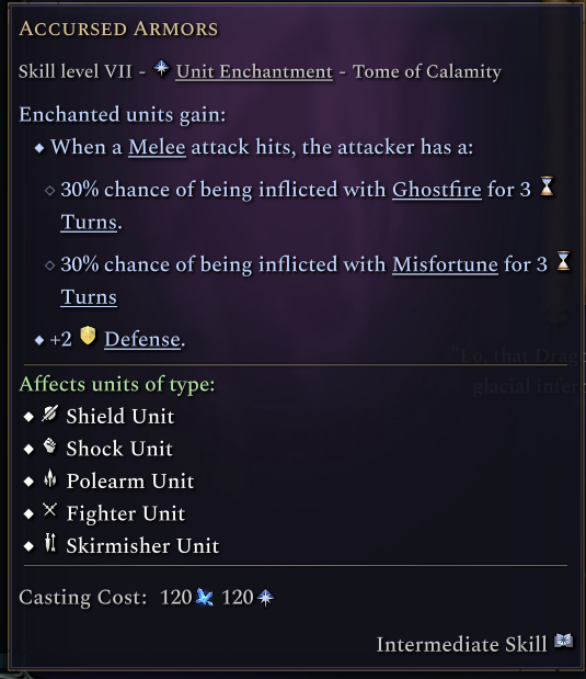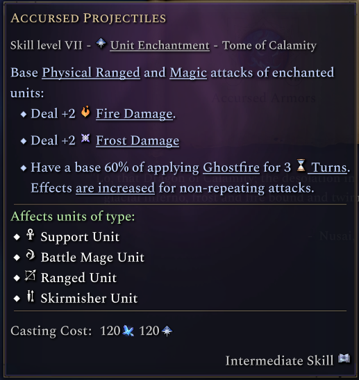 Accursed Armors applies to your melee units and makes them tougher while making their bodies cursed with calamity magic: melee attackers against this unit have a chance to suffer from Ghostfire and Misfortune. Accursed Projectiles gives your ranged units attacks a chance of applying Ghostfire while also adding Fire and Frost damage to their projectiles and magic.