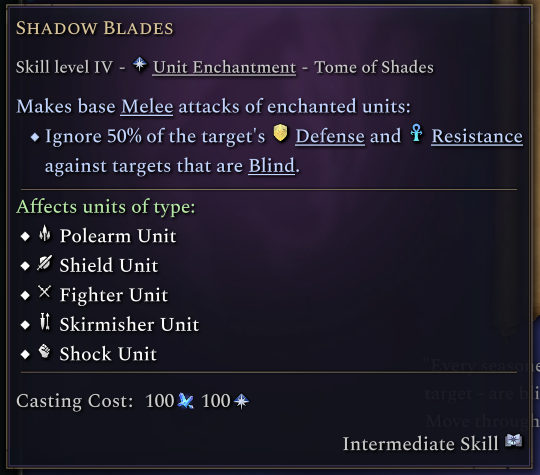 Shadow Blades is what makes all these Blind status pay off. Melee units with this enchantment ignore 50% of the target’s Defense and Resistance if the target is Blind, vastly increasing damage done against high defense targets.