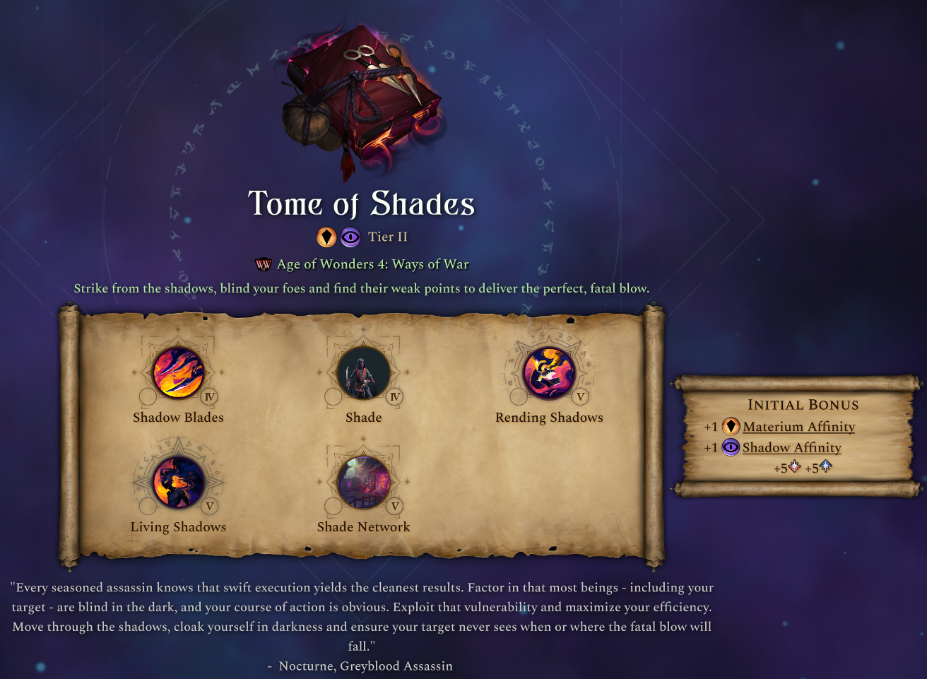 At Tier II and giving Materium and Shadow affinities is the Tome of Shades. This tome is all about blinding enemies in combat and then eviscerating them in their moment of weakness.