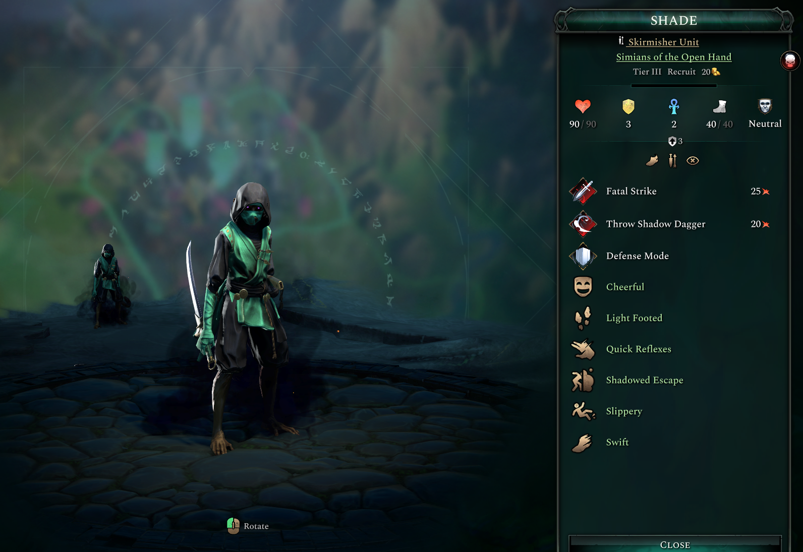 The Shade is a Tier III skirmisher with a kit that is all about poking enemies from afar and then going in for the kill. Throw Shadow Dagger is a ranged ability with a chance to Blind and when this unit is ready to engage in melee their main ability Fatal Strike is there to finish their enemy off, as its damage increases based on the missing Hit Points of their target.
