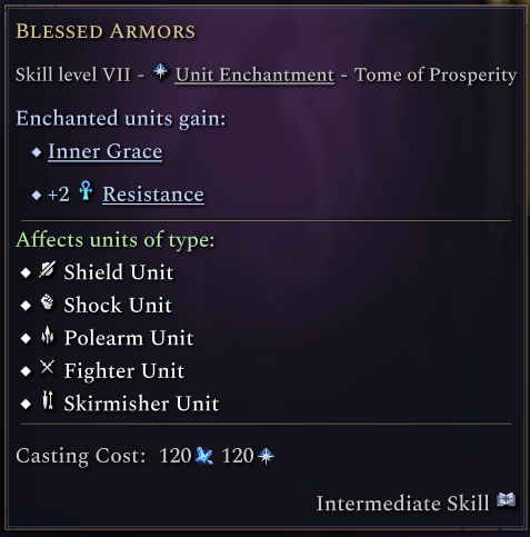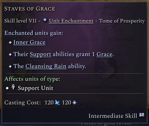 The two enchantments from this tome both give Inner Grace. This ability grants a stack of Grace if a unit starts its turn in combat without a stack of it.