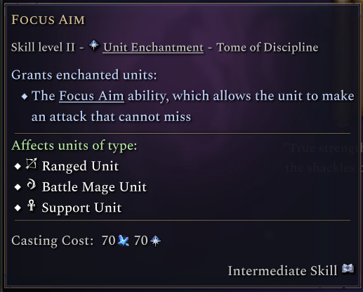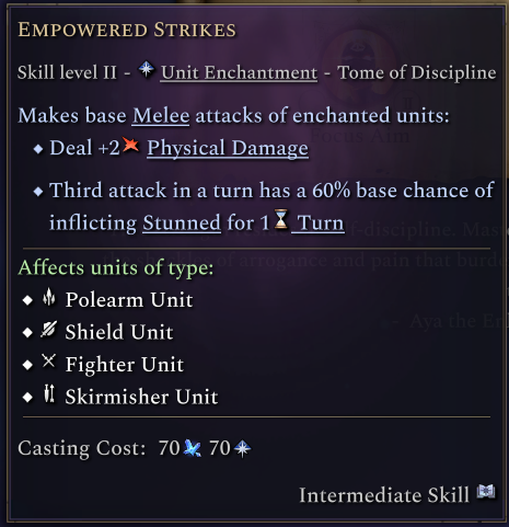 The Tome of Discipline has two unit enchantments. Empowered Strikes grants shield, polearm and fighter units extra damage and gives a similar effect to the Monk, where the third strike in a turn causes it to have a chance to stun their target. Focus Aim gives an ability that as a free action grants the unit True Strike for that turn, meaning their attacks cannot miss.