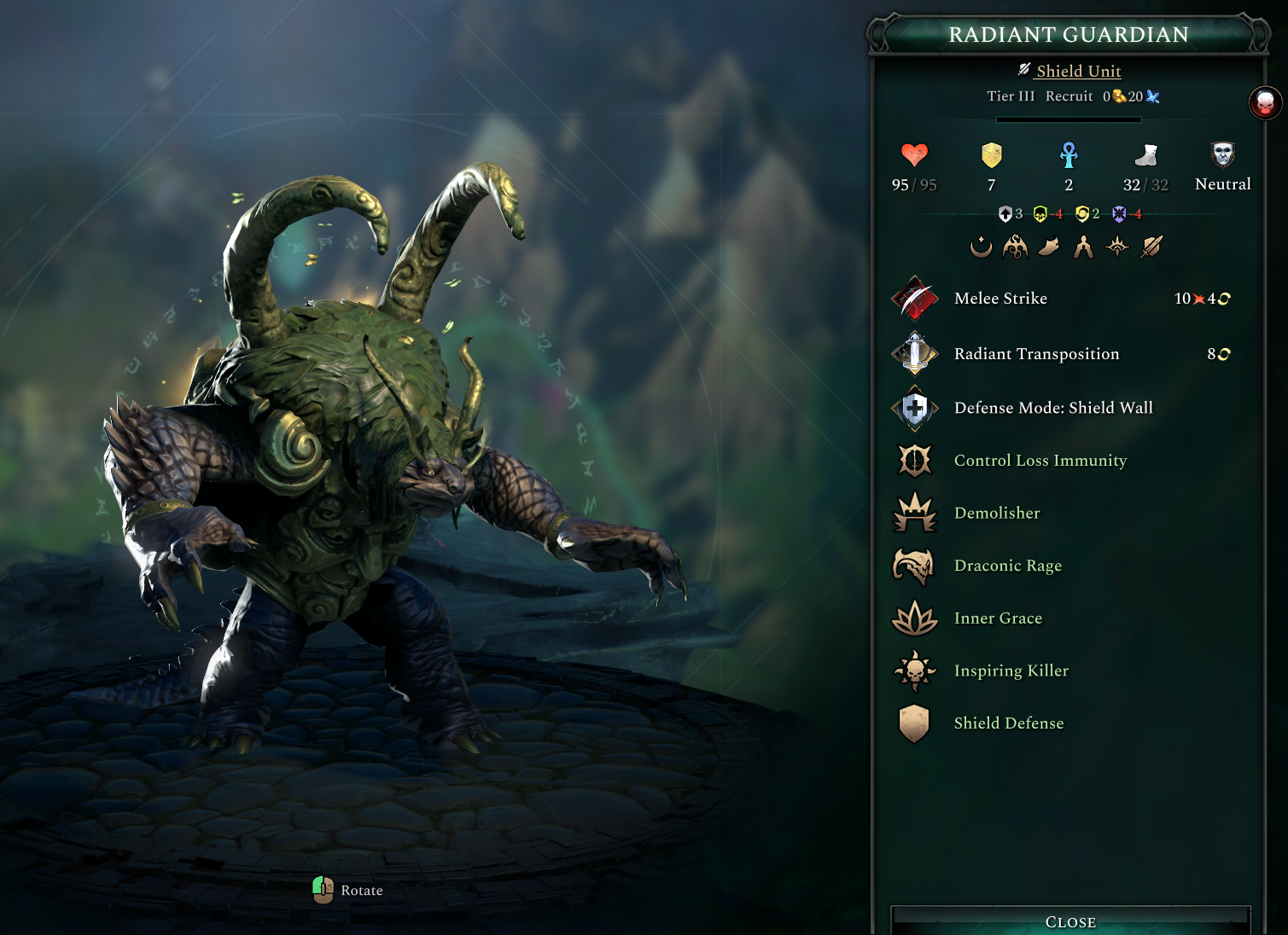 The Radiant Guardian is a Tier III Shield Unit whose special ability is its Radiant Transposition. The unit enters defense mode and swaps places with a friendly unit, dealing damage to all adjacent units after swapping. The ability also has a chance to apply Pacified to enemies, which disables their attacking abilities.