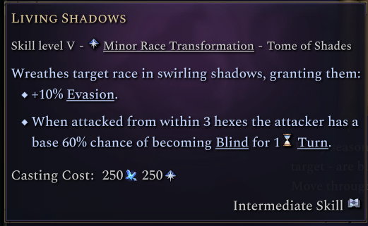 Living Shadows is a minor transformation found on this tome that grants evasion against ranged attacks while also retaliating against attackers by attempting to blind them.
