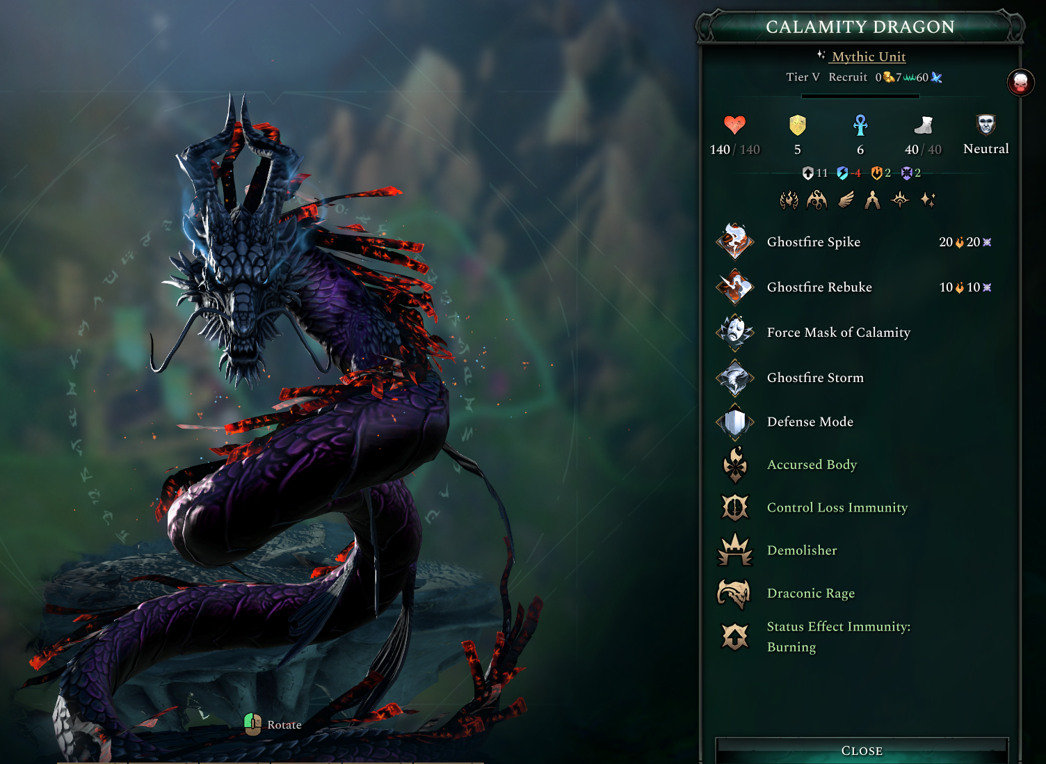 The Calamity Dragon is the Tier V that sits at the top of the accursed fiends family. Like the Prosperity Dragon its main attack is a long range ability, but the Calamity Dragon deals more damage and also applies Ghostfire.