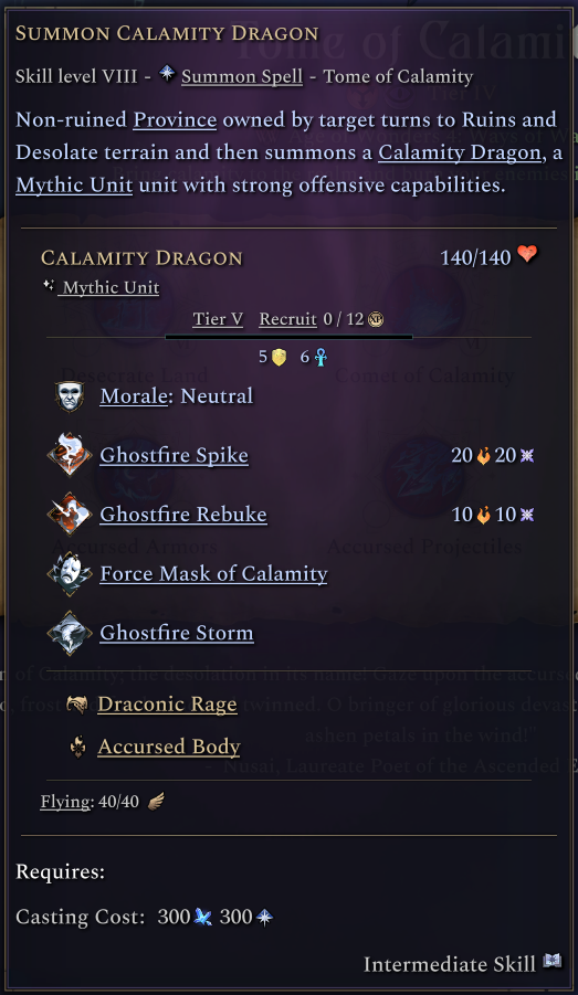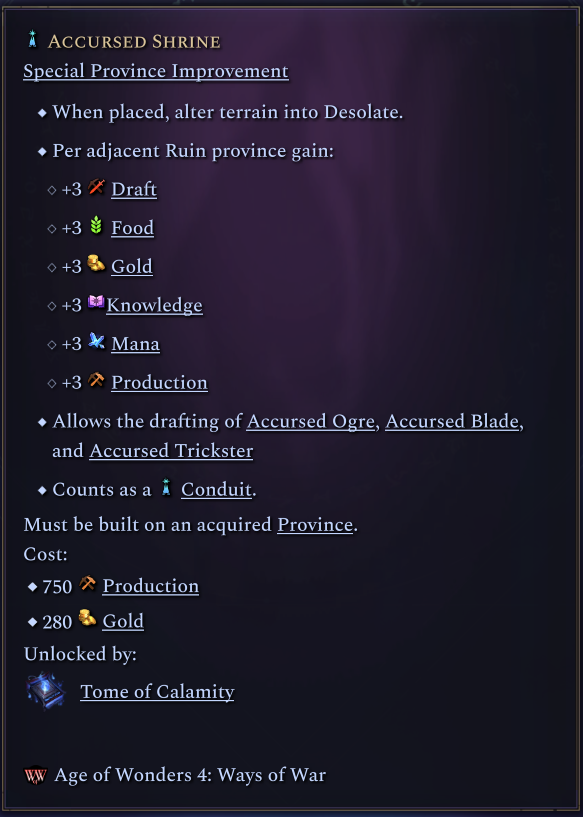 Summon Calamity Dragon summons a T5 offensive mythic unit. Like summon prosperity dragon, it also has an extra cost in that it can only be cast on an owned province and it will ruin it, as if it was pillaged. The Accursed Shrine gives access to the Accursed unit wildlife line, which we will talk about very soon, and it also makes it so all the Ruins this tome can causes can benefit your lands!