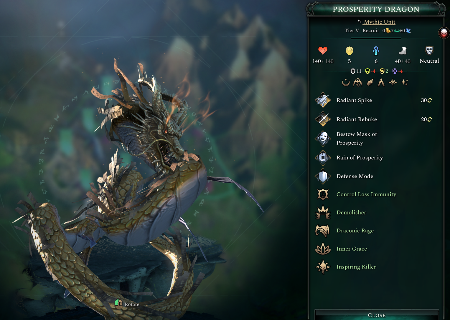 When linked to a unit the Prosperity Dragon gains the Recall Mask of Prosperity ability which breaks the link but for each Grace stack the Dragon has it heals 10 Hit Points and gains a stack of Regeneration, making the Dragon not only a great support unit but also tough.