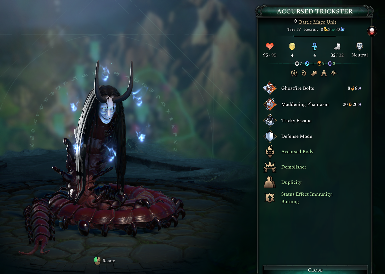 The Accursed Trickster is a strong Battle Mage unit. Its Maddening Phantasm is a full action ability that has a high chance to cause Insanity on a single target. Tricky Escape applies three stacks of ghostfire to a nearby enemy and makes the trickster teleport four hexes away from the target. On reaching 50% or lower of its hit points the Trickster clones itself. The copy deals less damage but acts like Astral Reflection in that if the original dies the copy takes its place!