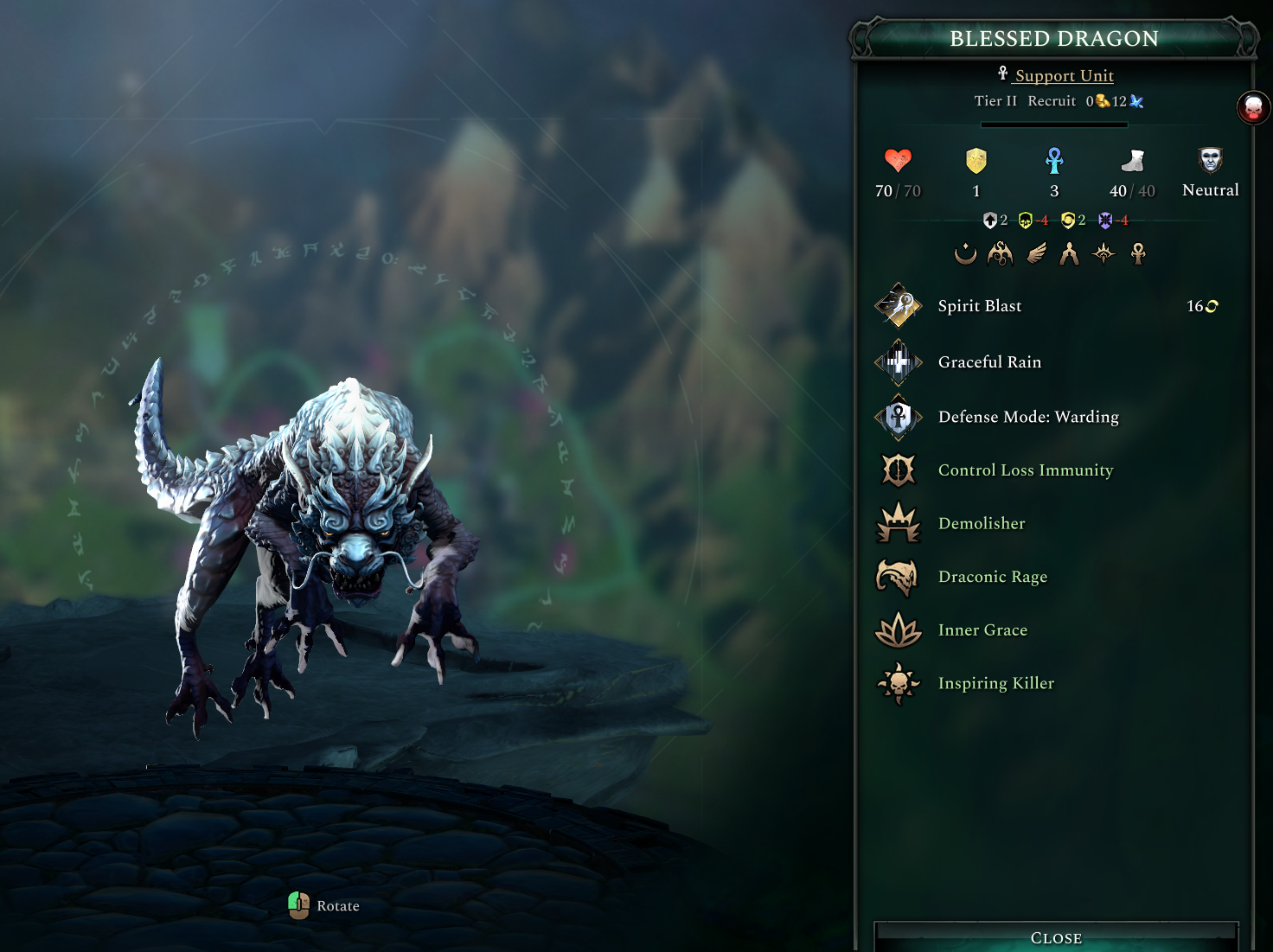 The Blessed Dragon is a Tier II Support Unit. Its Graceful Rain heals and grants a stack of Grace to all units in a 1-hex radius!