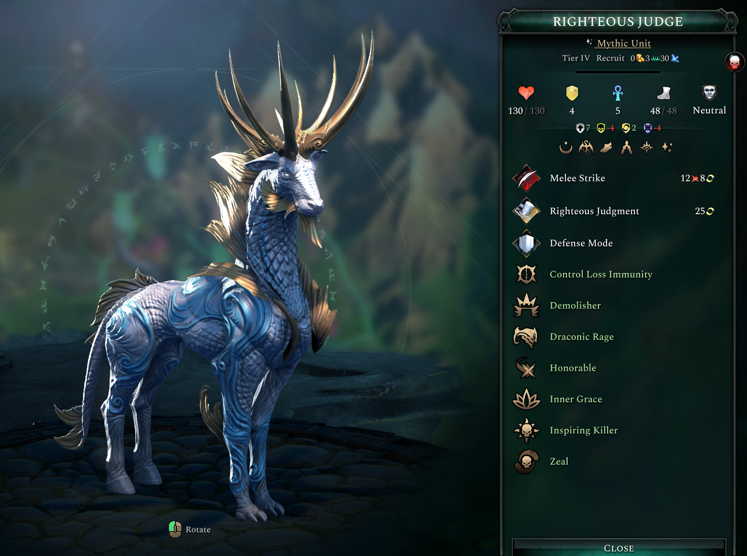 The Tier IV Righteous Judge is a Mythic unit with Zeal and a powerful melee attack that can apply Sundered Defense and Resistance. Its Righteous Judgment ability is a free action ability that doubles its damage against Condemned enemy units. If the double damage doesn’t trigger, then the target becomes condemned so that you can smite them harder next time you use this ability.