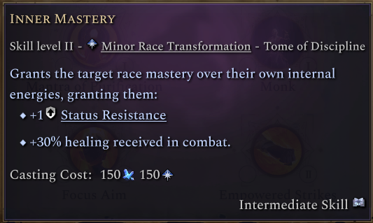 The minor transformation Inner Mastery grants a small bonus to status resistance while also giving your racial units increased healing in battle.