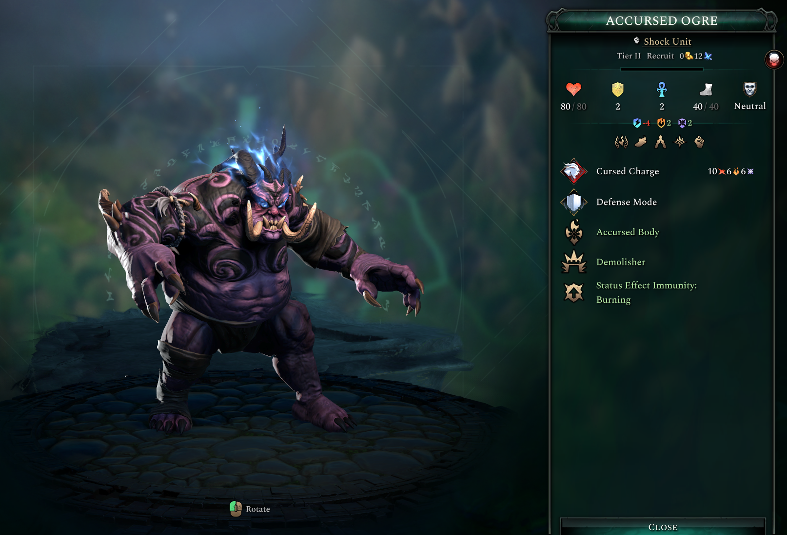 The Accursed Ogre is a Tier II shock unit. Its Cursed Charge always applies a stack of Ghostfire while pushing and moving the ogre into the hex the target was in.