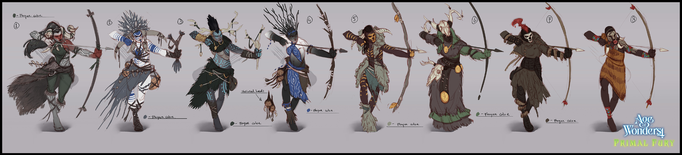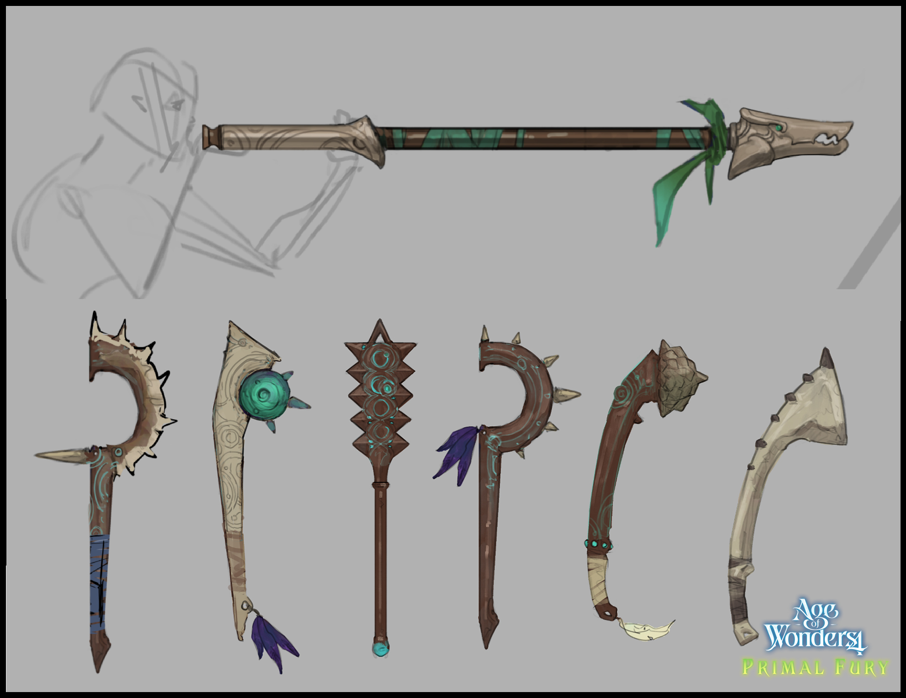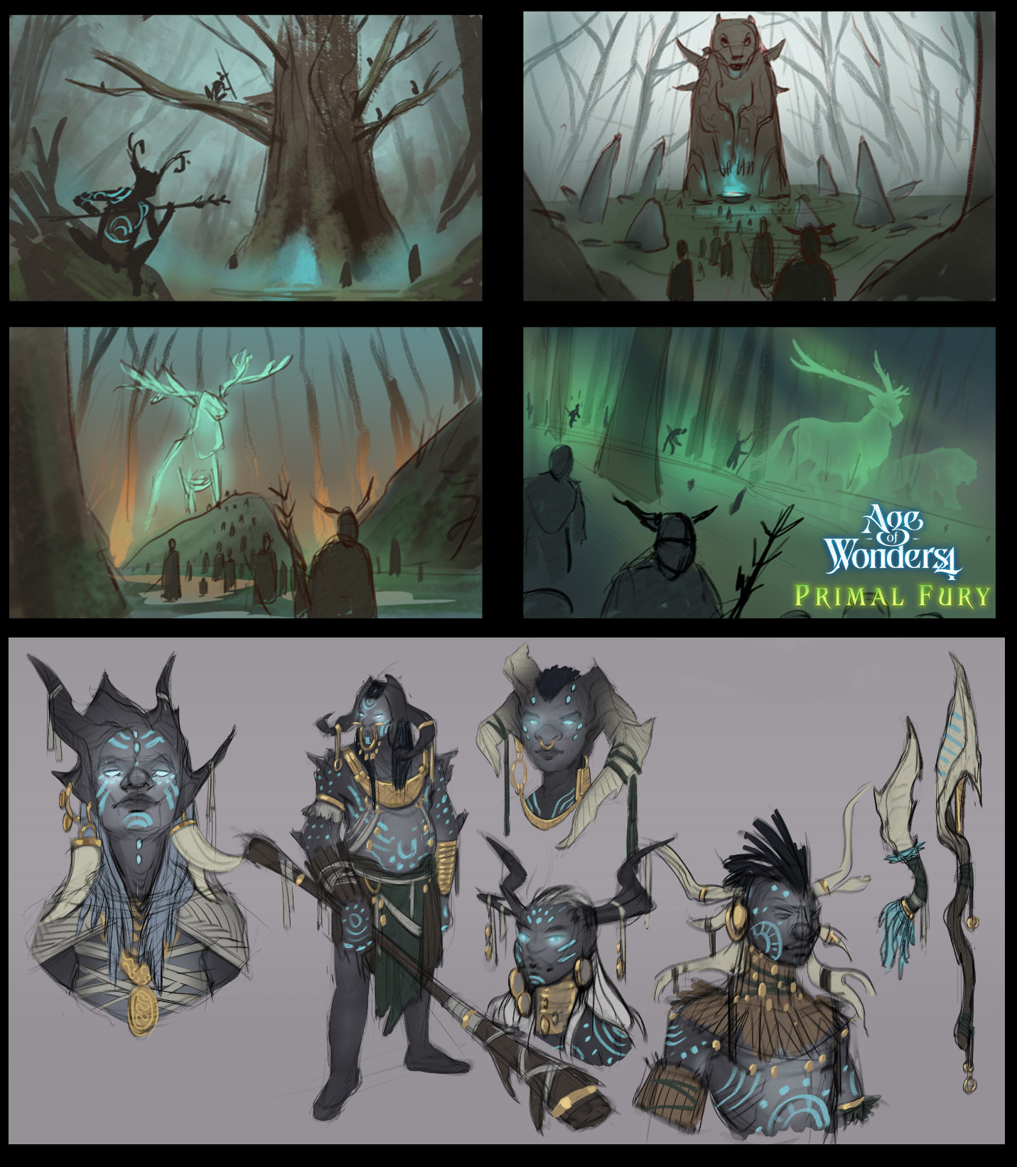 When it comes to Primal Fury we knew we wanted a new Wild nature affinity themed culture. We started with some early mood exploration, playing with a neolithic vibe combined with animism, spirituality and tribal motifs -