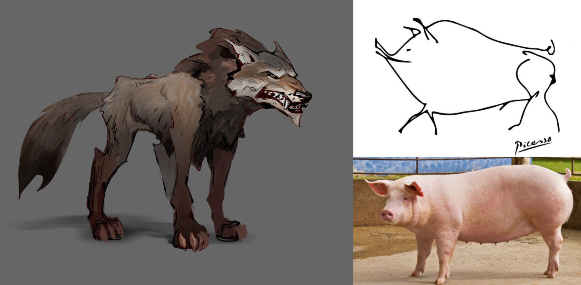 Part of the art direction of wildlife is to capture the essence and character, much like a caricature portrait pushes proportions and expression to elicit a feeling. Below we see a small scribble from Picasso and a picture of a real pig, personally I find Picasso’s drawing of a pig more fun than the actual pig photo. We try to use this as an example to push expression through our characters to make them more interesting. Here we see the wolf’s proportion, snarl and pose bring about the essence of what a wolf is more so than what a photo would-