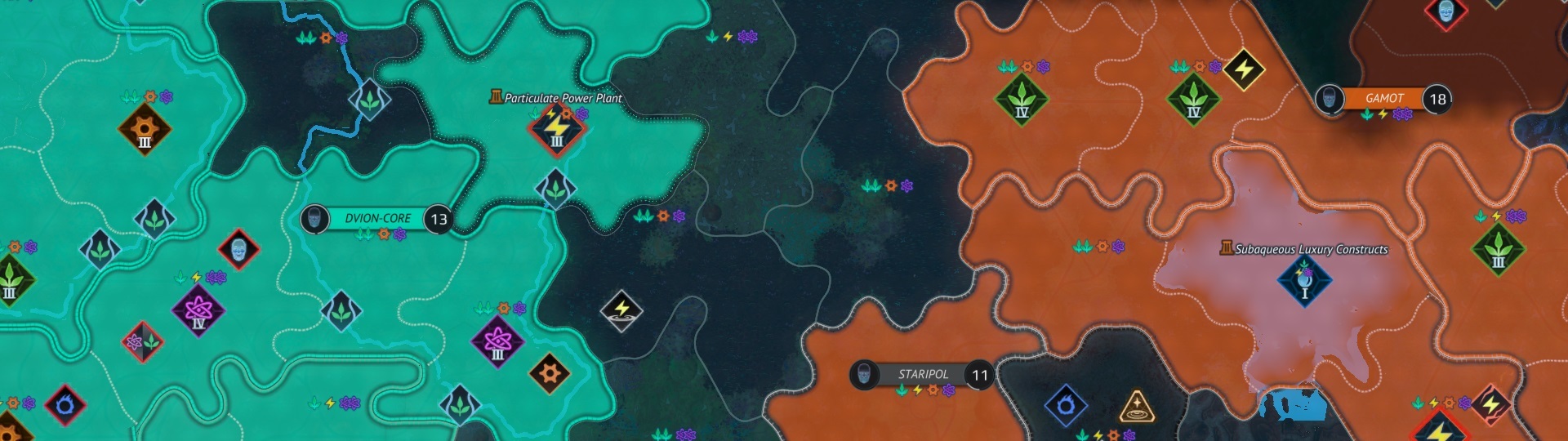 The player now gains resources of various types for razing enemy colonies and sectors. This provides more incentive for defending players to actively defend their territory rather than hiding in their cities. It also incentivizes players to destroy captured colonies, rather than keep them, leading to smaller empires which are easier for the players to manage.Factions and Secret Techs
