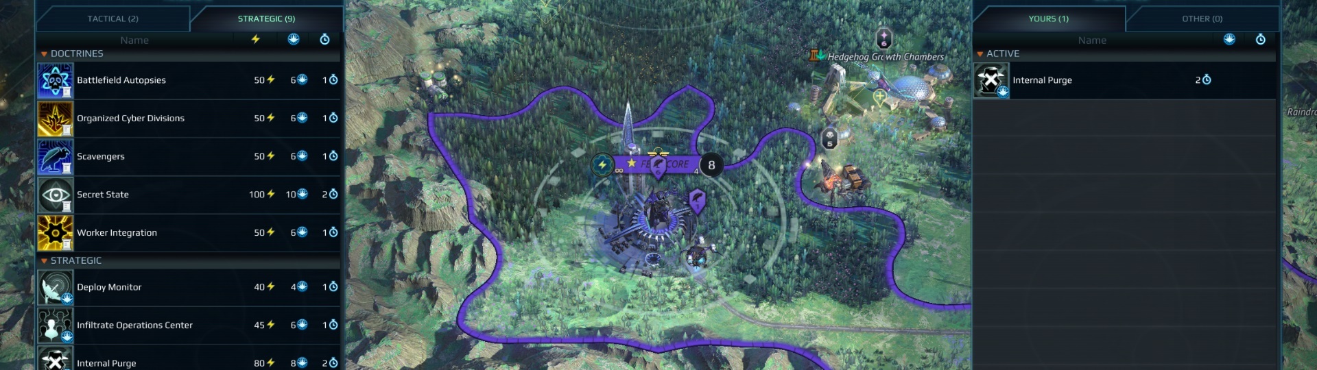 The doctrines in the game have received a balance pass to reduce the cost to deploy them. The tech tree has been re-arranged slightly to make the racial and secret tech doctrines more attractive to the player, by adding shortcuts allowing the player to unlock high level doctrines by doing economic research (previously the player could only unlock high level doctrines by researching all the lower level ones first) and allowing the player to earn doctrine slots by researching doctrines (previously doctrine slots could only be unlocked by researching a separate area of the tech tree).Operations Interface Improvements