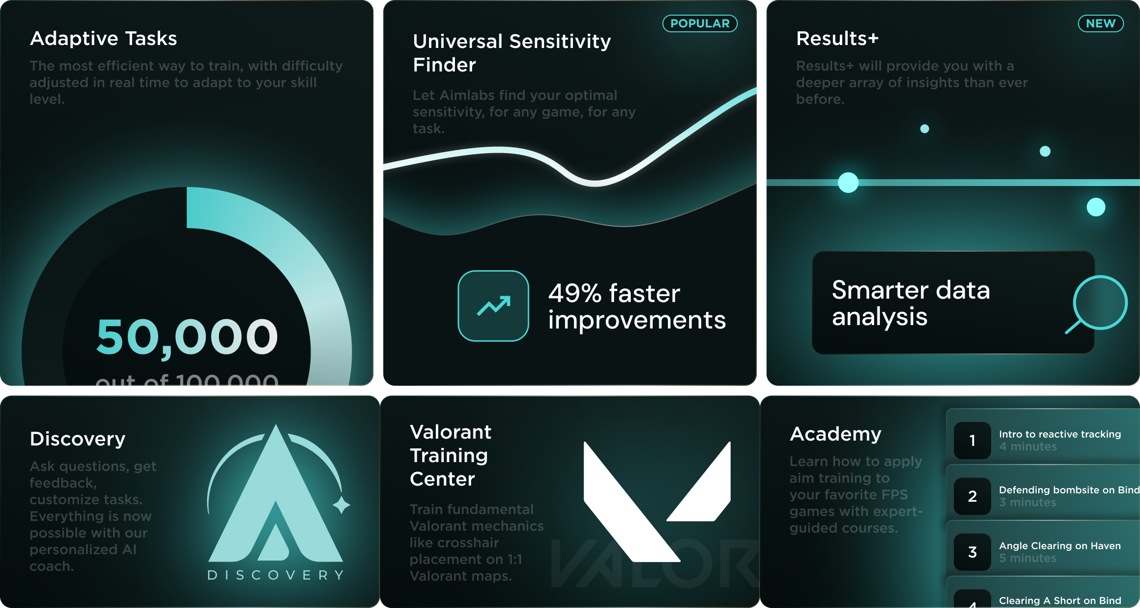 [b]Universal Sens Finder[/b] - Find the perfect sensitivity for your game or task of choice! [b]Adaptive Tasks[/b] - Train at the perfect difficulty level to maximize your improvement! [b]VALORANT Training Center[/b] - Train fundamental VALORANT mechanics such as crosshair placement on 1:1 map recreations! [b]And so much more[/b] - Aimlabs Academy, Premium Seasonal Battle Pass, and 50% off all shop purchases!