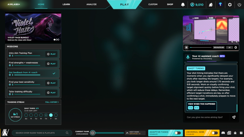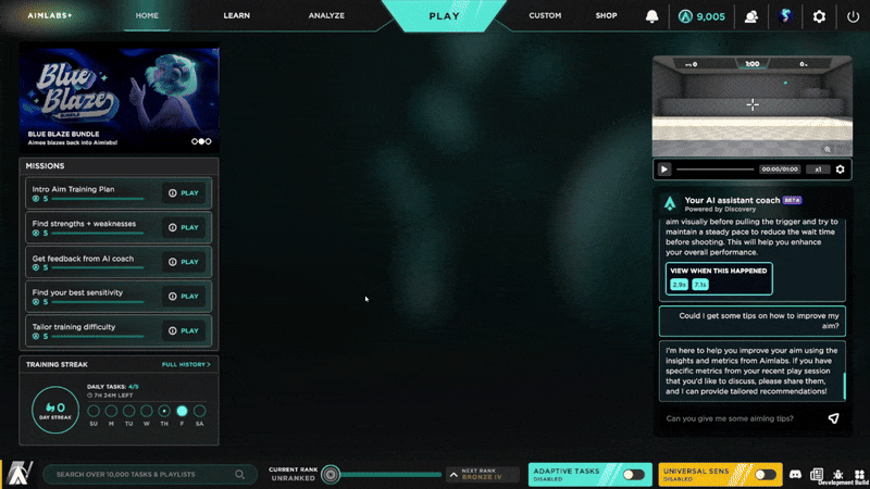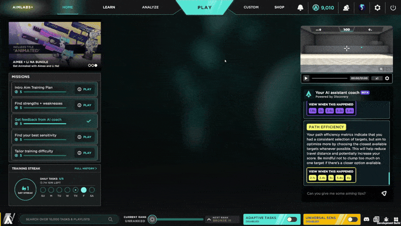 The new Aimlabs+ Members-Only Home Screen also features our new Daily Missions, which will help you make the most of [b]everything that Aimlabs+ has to offer[/b], as well as Task suggestions, with recommendations based on your recent aiming trends!