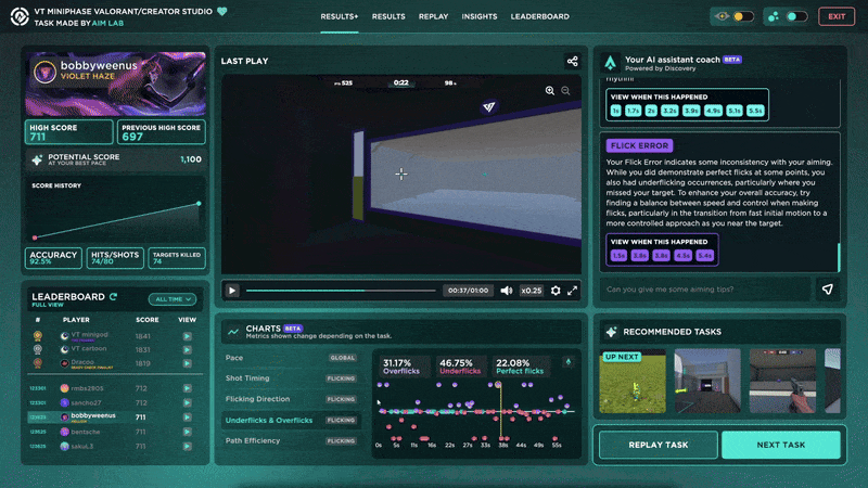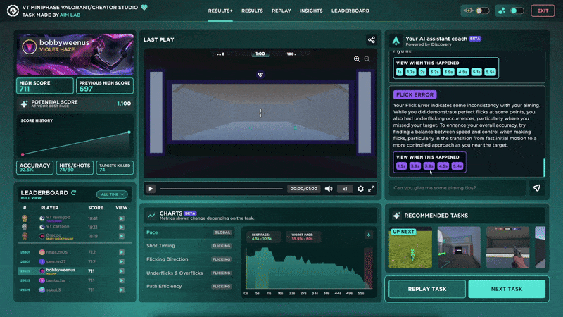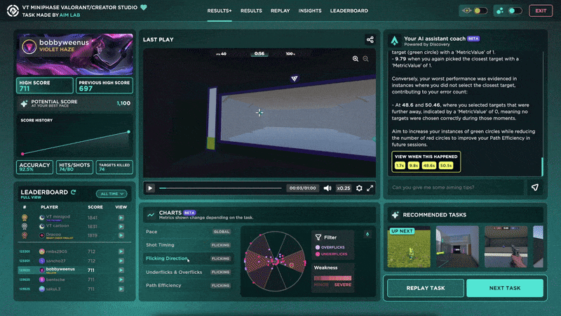 We have worked with experts in aim training to create several advanced metrics, such as Shot Timing, Path Efficiency, Flicking Direction, and Underflicks & Overflicks, as well as Edge Tracking, Smoothness, Prediction, and Pace, all of which can be identified, explained, and displayed through the Results+ screen on brand new visually comprehensive charts and our improved Replay screen, with more advanced metrics coming soon!